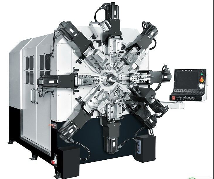 永騰無凸輪彈簧機(jī)在國內(nèi)的應(yīng)用,在近幾年間逐漸得到認(rèn)可。與傳統(tǒng)帶凸輪電腦彈簧機(jī)相比,無凸輪彈簧機(jī)在設(shè)計(jì)上采用獨(dú)特的無凸輪和無搖臂技術(shù),其中刀架采用八組伺服馬機(jī)獨(dú)立完成驅(qū)動(dòng)控制,調(diào)試過程中節(jié)省了排凸輪片的時(shí)間,而且更方便多角度彈簧產(chǎn)品成形,具有調(diào)試方便、加工能力強(qiáng)和成形速度快等特點(diǎn)。