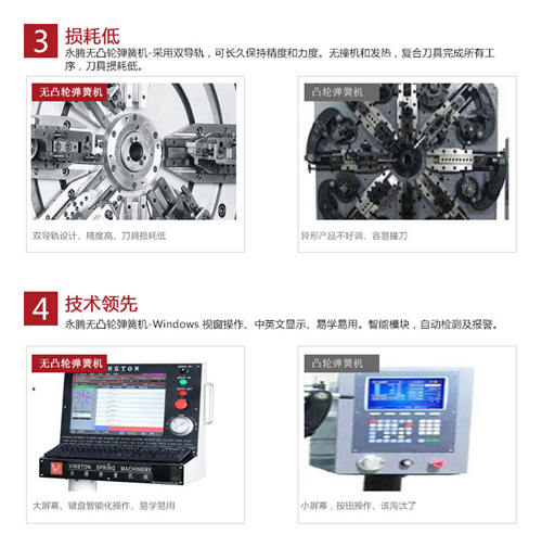 在近幾年無凸輪彈簧機逐漸得到彈簧生產(chǎn)廠家的認(rèn)可。與傳統(tǒng)帶凸輪彈簧機相比,永騰無凸輪彈簧機在設(shè)計上采用獨特