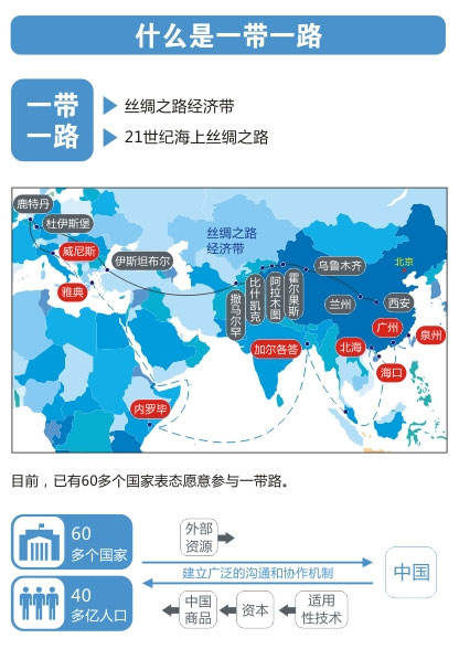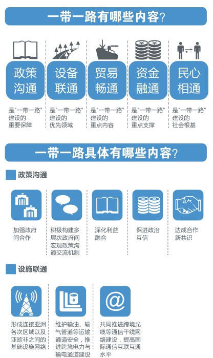 “一帶一路”建設是一項系統(tǒng)工程,要堅持共商、共建、共享原則,積極推進沿線國家發(fā)展戰(zhàn)略的相互對接。為推進實施“一帶一路”重大倡議,讓古絲綢之路煥發(fā)新的生機活力,以新的形式使亞歐非各國聯(lián)系更加緊密,互利合作邁向新的歷史高度,中國政府特制定并發(fā)布《推動共建絲綢之路經(jīng)濟帶和21世紀海上絲綢之路的愿景與行動》。