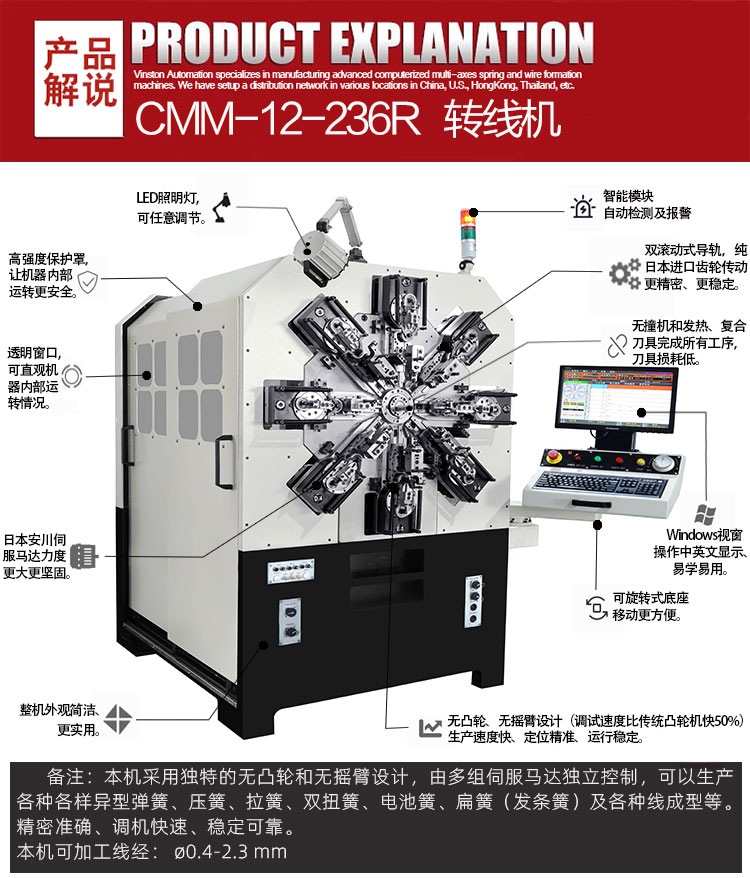 • 產(chǎn)品概述: CMM-12-236R 轉(zhuǎn)線彈簧機.可生產(chǎn)?0.4-2.3 mm線徑彈簧及線成形等)本機采用獨特的無凸輪和無搖臂設(shè)計,由多組伺服馬達獨立控制,可以生產(chǎn)各種各樣異型彈簧、壓簧、拉簧、雙扭簧、電池簧、扁簧(發(fā)條簧)及各種線成型等。精密準確、調(diào)機快速、穩(wěn)定可靠。