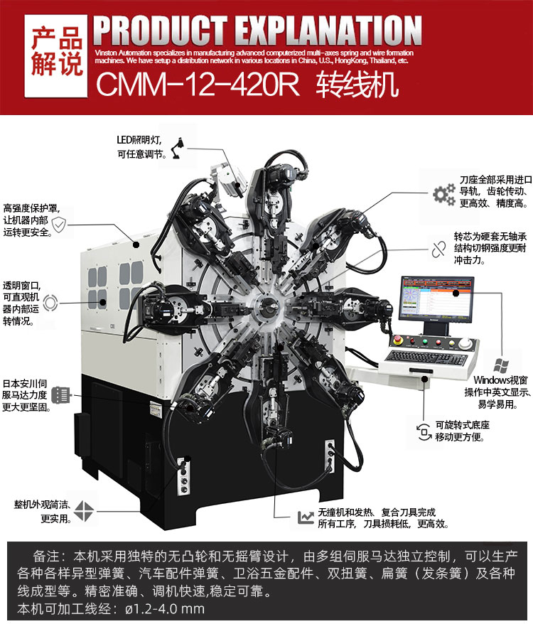 本機(jī)型適用于生產(chǎn)汽車、摩托車、自行車、線成型等車輛以及娛樂(lè)健身器材等產(chǎn)品所需的高精密彈簧產(chǎn)品