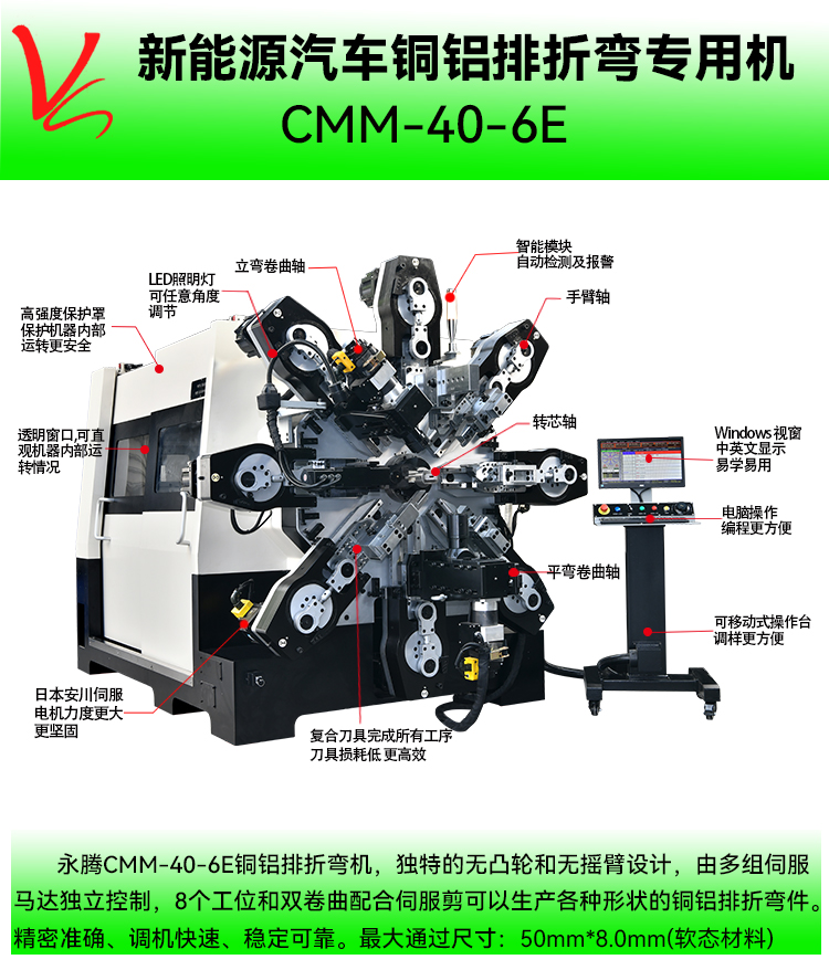 - 產(chǎn)品概述: CMM-40-6E銅鋁排折彎?rùn)C(jī)(最大通過(guò)尺寸:50mm*8.0mm)集3D折彎?rùn)C(jī)和彈簧機(jī)所有的功能于一體的多功能專用機(jī),本機(jī)采用獨(dú)特的無(wú)凸輪和無(wú)搖臂設(shè)計(jì),由多組伺服馬達(dá)獨(dú)立控制,永騰銅鋁排折彎?rùn)C(jī)廣泛應(yīng)用于導(dǎo)電排成型,新能源電池連接排、新能源電池模組、銅母排成型、硬排成型、導(dǎo)電排、電池連接排、銅排、裸排成型等。精密準(zhǔn)確、調(diào)機(jī)快速、穩(wěn)定可靠。