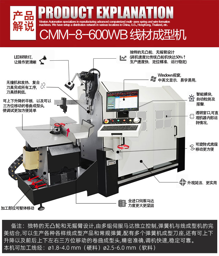 特別說明:本機(jī)重點(diǎn)為衛(wèi)廚五金行業(yè)量身打造。除此外,還適用于汽車、摩托車、自行車等及娛樂健身器材所需的高精密彈簧及線成型的生產(chǎn)。