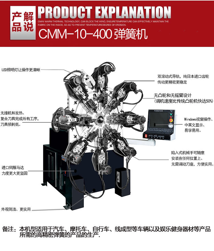 獨特的無凸輪和無搖臂設(shè)計,由多組伺服馬達(dá)獨立控制,可以生產(chǎn)各種各樣異型彈簧、壓簧、雙扭簧、電池簧、扁簧(發(fā)條簧)及各種線成型等。精密準(zhǔn)確、調(diào)機(jī)快速、穩(wěn)定可靠。