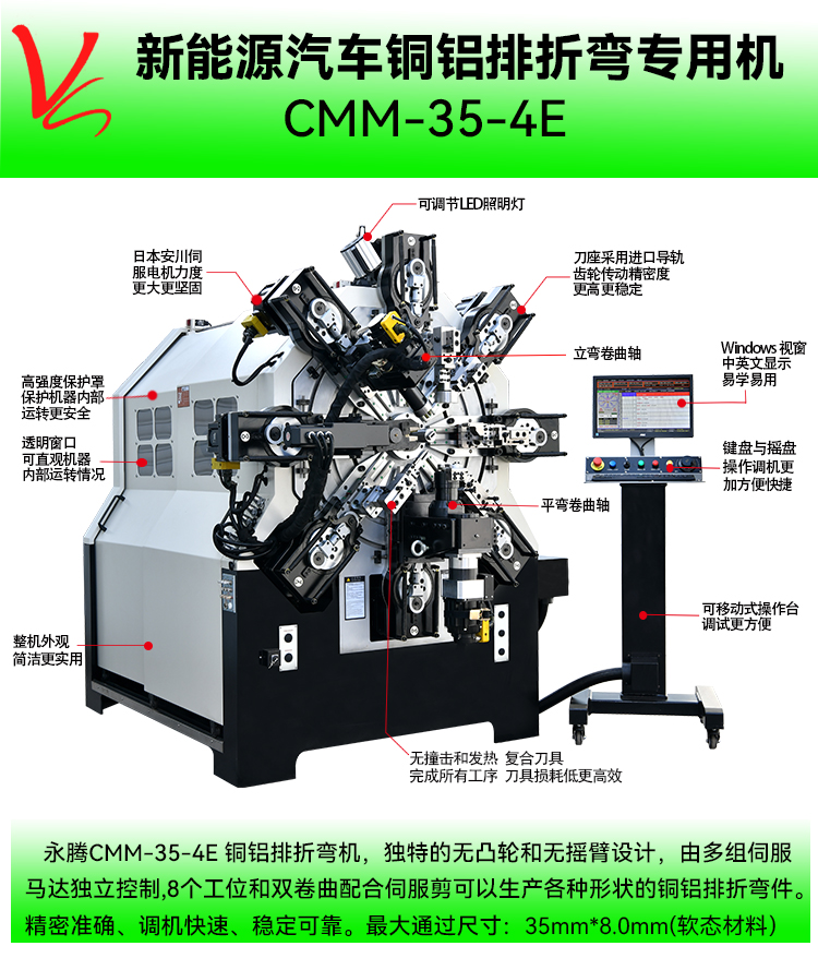 • 產(chǎn)品概述: CMM-35-4E銅鋁排折彎機(jī)(最大通過尺寸:35mm*8.0mm)集3D折彎機(jī)和彈簧機(jī)所有的功能于一體的多功能專用機(jī),本機(jī)采用獨(dú)特的無凸輪和無搖臂設(shè)計(jì),由多組伺服馬達(dá)獨(dú)立控制,永騰銅鋁排折彎機(jī)廣泛應(yīng)用于導(dǎo)電排成型,新能源電池連接排、新能源電池模組、銅母排成型、硬排成型、導(dǎo)電排、電池連接排、銅排、裸排成型等。精密準(zhǔn)確、調(diào)機(jī)快速、穩(wěn)定可靠。